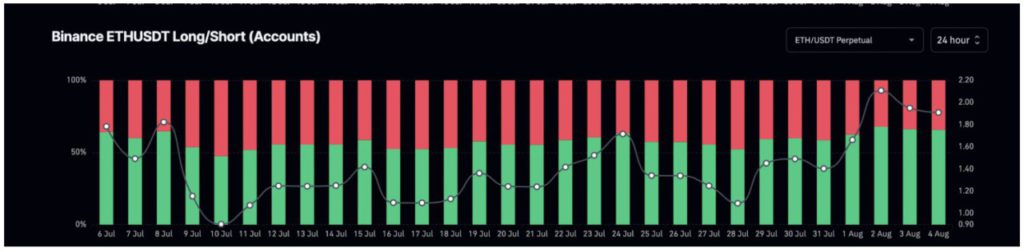 Selain data on-chain, perilaku trader di bursa derivatif juga menunjukkan kecenderungan bullish. Data Binance Long/Short Account Ratio menempatkan ETH di angka 1,91, artinya jumlah akun yang membuka posisi long hampir dua kali lipat dari yang short. Rasio ini berbeda dengan rasio volume posisi karena menghitung jumlah akun, bukan besar transaksi.