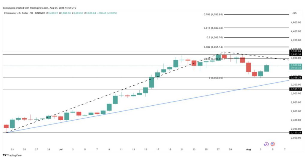Dari sisi teknikal, grafik harian Ethereum menunjukkan pola ascending triangle yang menandakan potensi lanjutan tren bullish. ETH sempat mengalami lonjakan dari level $2.120 (Rp34,7 juta) ke $3.939 (Rp64,5 juta), sebelum masuk fase konsolidasi ketat. Level Fibonacci 0,236 di $3.785 (Rp61,9 juta) sempat diuji namun ditembus, memicu candle merah panjang dan aksi jual singkat di pasar.