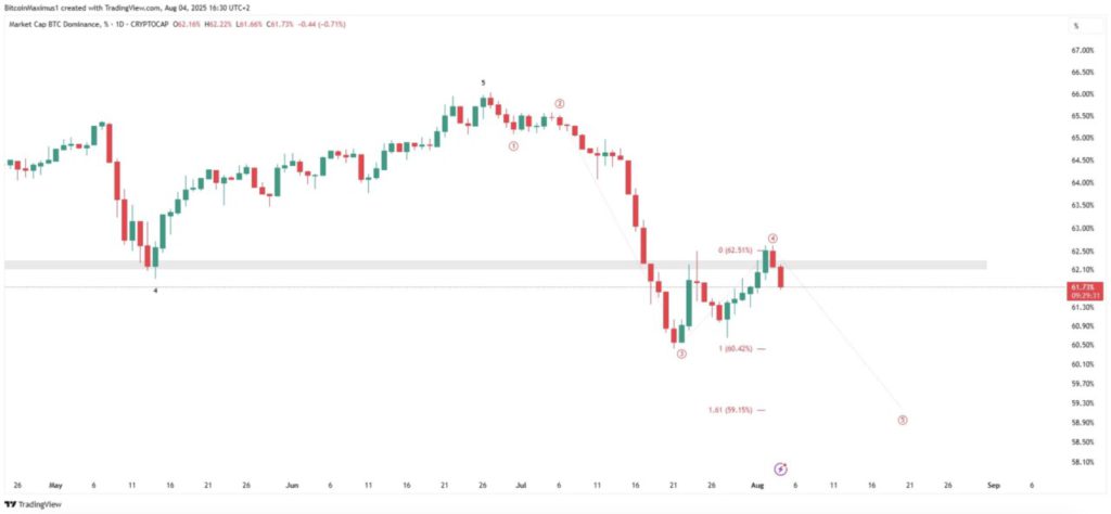 Berdasarkan perhitungan gelombang (wave count), BTCD kini memasuki gelombang kelima sekaligus terakhir dari tren penurunan, yang diperkirakan bisa mencapai titik terendah di sekitar 59,15%.