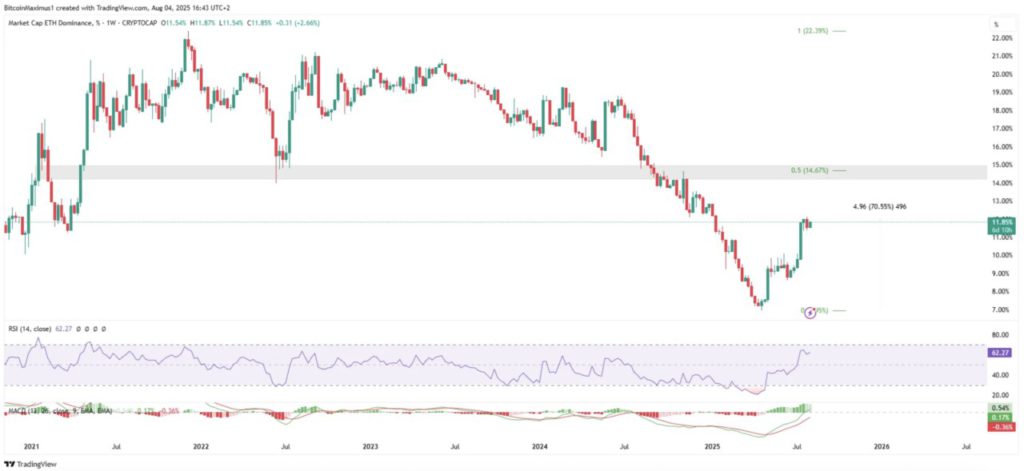 Ethereum menjadi pemimpin reli ini, dengan tingkat dominasinya yang kini naik ke 12%.
