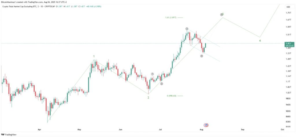 Jika penembusan ini berhasil dikonfirmasi, hal tersebut akan menandai dimulainya fase akhir dari gelombang ketiga (hijau), dengan target rekor baru di sekitar $1,69 triliun.
