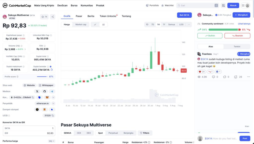 Grafik Sekuya Multiverse (SKYA) di CoinMarketCap menunjukkan pergerakan harga dalam rentang 1 bulan terakhir dengan tren yang cukup fluktuatif. Saat ini, harga SKYA berada di Rp92,83, naik 35,52% dalam sebulan terakhir. Kapitalisasi pasar tercatat di Rp37,43 miliar, dengan volume perdagangan 24 jam Rp3,98 miliar, naik 8,61% dibandingkan hari sebelumnya.