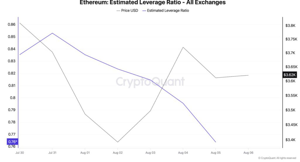 Menurut data dari CryptoQuant, penurunan estimated leverage ratio (ELR) Ethereum di seluruh bursa kripto mencerminkan turunnya kepercayaan investor serta semakin rendahnya minat risiko dari para trader futures. Saat ini, ELR ETH berada di level terendah mingguan, yaitu 0,76.