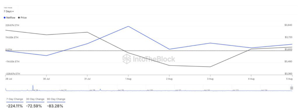 Berdasarkan data dari IntoTheBlock, netflow dari pemegang besar ETH turun sebesar 224% dalam tujuh hari terakhir, menandakan mundurnya investor besar dari pasar ETH.