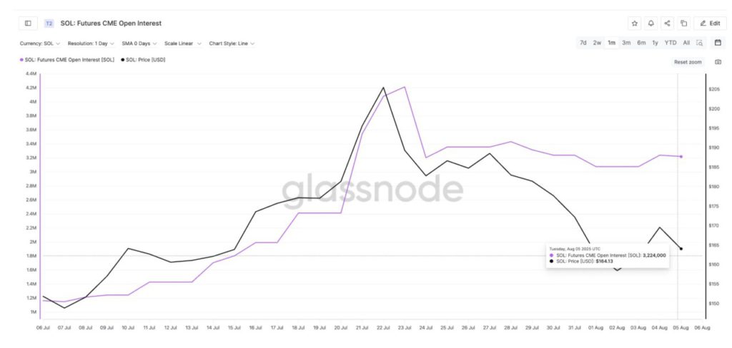 Sebagai contoh, pada 1 Agustus, open interest di CME tercatat stabil di angka 3,07 juta, sementara harga SOL turun dari $162 menjadi $158. Namun, tak lama setelah itu, harga dengan cepat kembali naik ke $169 saat gap tersebut mulai menyempit.