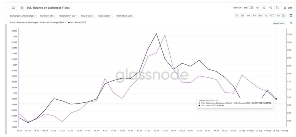 Dari 33,06 juta SOL pada 23 Juli, angkanya turun tajam menjadi 30,78 juta SOL per 5 Agustus — penurunan hampir 10%. Artinya, semakin sedikit token yang tersedia di exchange, sebuah sinyal klasik bahwa tekanan jual mulai mereda.
