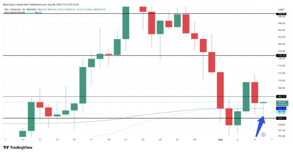 Sinyal terakhir — dan mungkin paling menarik bagi para trader — muncul dari grafik harian harga Solana. Per 6 Agustus, garis EMA 100-hari (warna biru muda) mulai mendekati EMA 200-hari (biru tua) dari bawah.