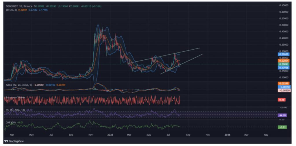 Sementara itu, pada grafik harian, DOGE diperdagangkan dalam kanal naik dan saat ini sedang menguji garis support bagian bawah — yang juga berdekatan dengan batas bawah Bollinger Band di sekitar $0,179.