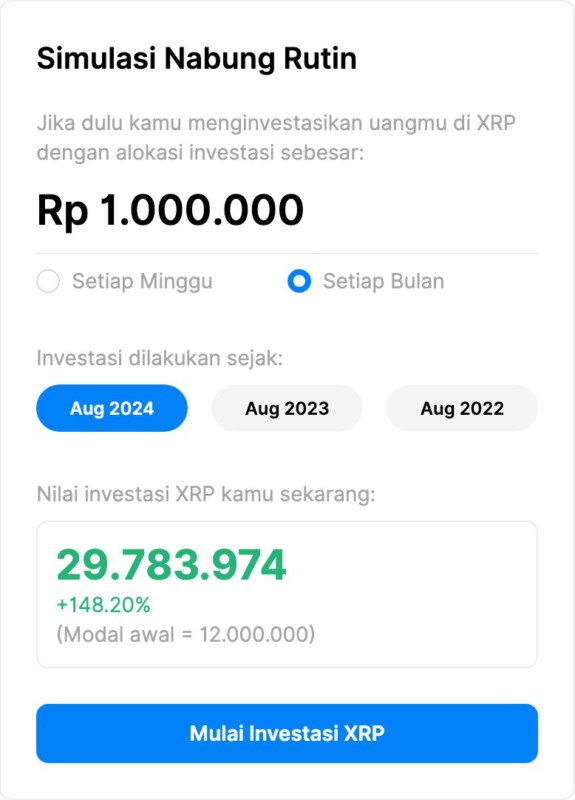 Pada simulasi kali ini, kita akan melihat performa DCA pada aset XRP selama 12 bulan terakhir, dengan pembelian rutin Rp1 juta setiap bulan mulai Agustus 2024 hingga Agustus 2025.