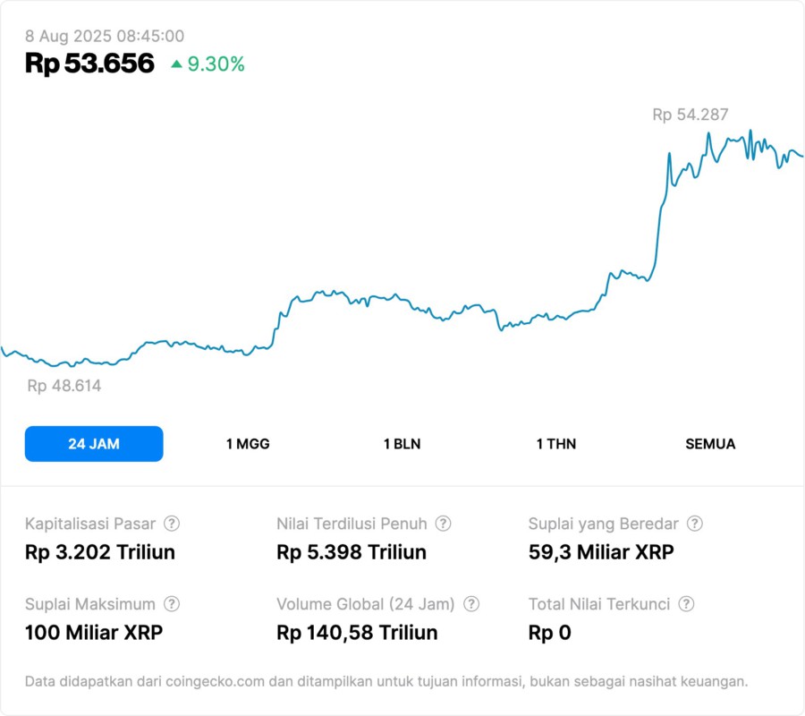 • Harga XRP per 8 Agustus 2025: Rp53.656 (+9,30% dalam 24 jam terakhir)