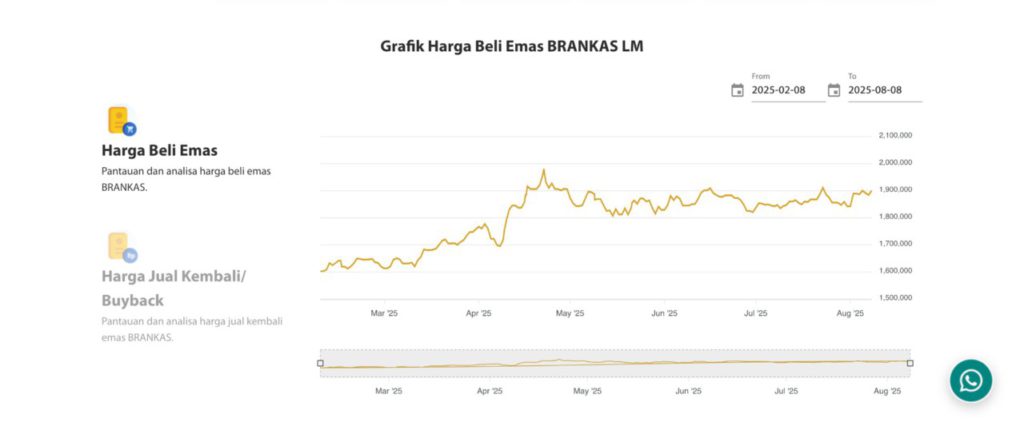 Grafik harga emas Antam dalam enam bulan terakhir memperlihatkan tren yang cukup fluktuatif. Sejak Februari 2025, harga sempat menyentuh area di bawah Rp1,7 juta per gram, lalu mengalami kenaikan tajam pada April 2025, sebelum stabil di kisaran Rp1,85–Rp1,95 juta per gram.