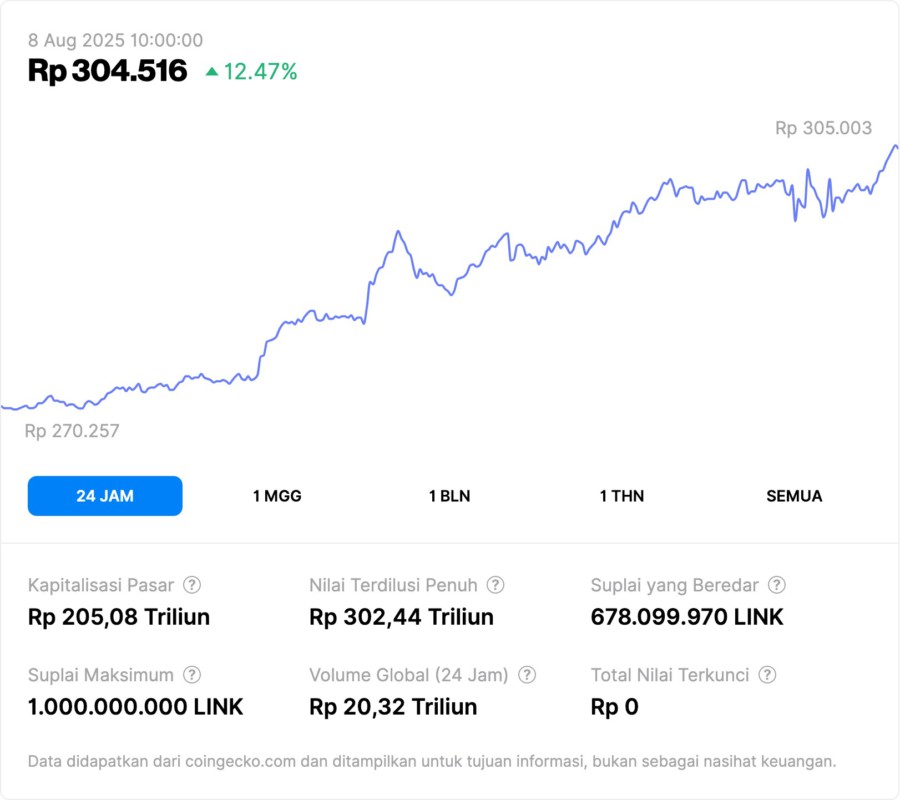 Chainlink mencatat reli kuat hingga menembus Rp305 ribu hari ini, dipicu sentimen positif dari integrasi orakel terdesentralisasi mereka dengan berbagai proyek DeFi. Lonjakan harga ini membuat LINK mencetak kenaikan tahunan hingga dua kali lipat.