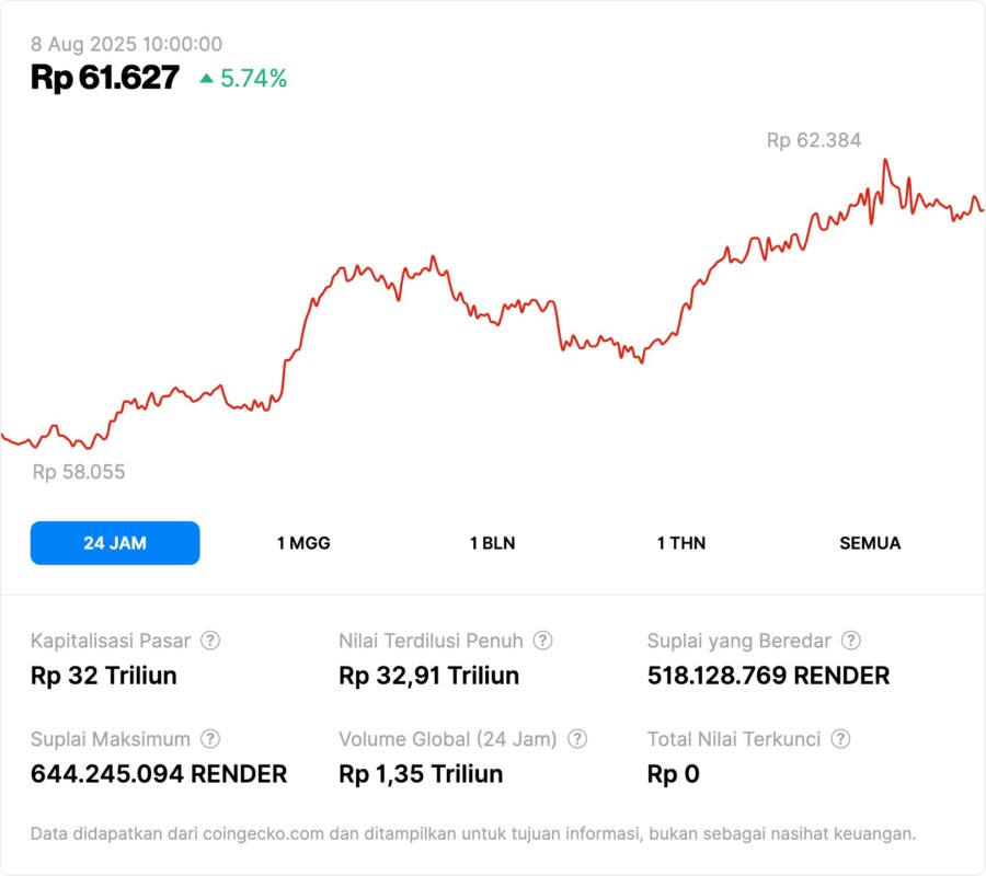 Render, yang fokus pada rendering GPU terdesentralisasi untuk Metaverse dan AI, kembali mencatat tren positif. Kenaikan harga RNDR diiringi minat investor pada proyek infrastruktur Web3 yang mendukung AI.