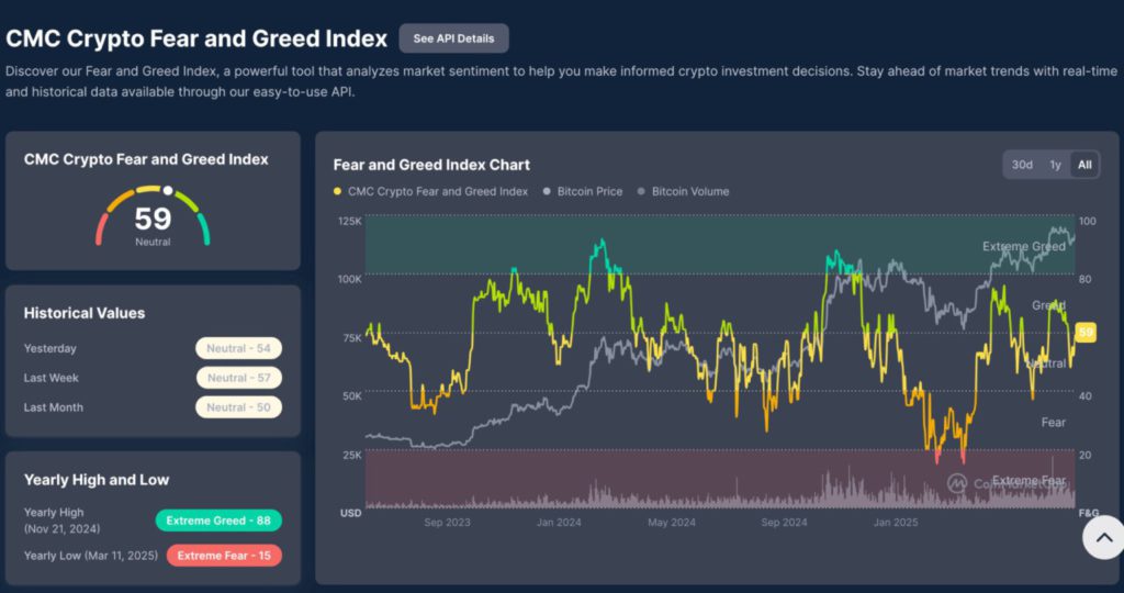 Jakarta, Pintu News ā Indeks Fear and Greed crypto dari CoinMarketCap (CMC) menunjukkan angka 59 atau berada di zona Netral. Angka ini mengindikasikan bahwa pasar saat ini tidak berada dalam kondisi euforia berlebihan (greed) maupun ketakutan ekstrem (fear), melainkan dalam fase konsolidasi yang relatif seimbang.