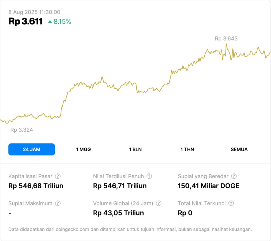 Jakarta, Pintu News ā Harga Dogecoin kembali mencatat lonjakan signifikan pada Kamis, 8 Agustus 2025. Berdasarkan data Pintu Market, DOGE diperdagangkan di kisaran Rp3.611 per koin, naik 8,15% dalam 24 jam terakhir, dengan kapitalisasi pasar mencapai Rp546,68 triliun.