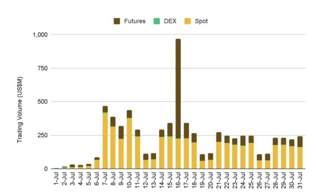 Data di platform X menunjukkan PancakeSwap mengalami kenaikan jumlah pengguna dan volume perdagangan pada Juli, dengan total volume perdagangan spot melampaui US$188 miliar — setara 43% dari total pangsa pasar perdagangan DEX.