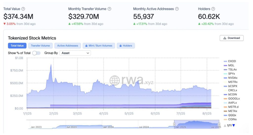 Menurut data RWA.xyz, kapitalisasi pasar saham ter-tokenisasi telah mencapai $374 juta, naik 220% sejak Juni. Volume transfer bulanan berada di kisaran $330 juta. Algorand memimpin pangsa pasar saham ter-tokenisasi sebesar 66%, didorong oleh saham EXOD milik Exodus.