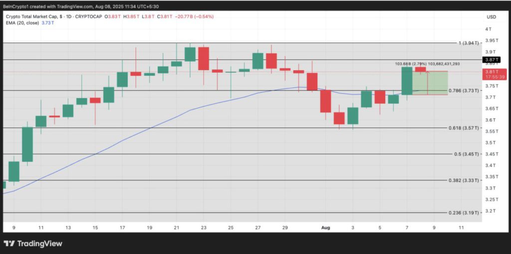 Kapitalisasi pasar keseluruhan crypto kini berada di kisaran Rp62.115 triliun ($3,81 triliun) setelah berhasil menembus dan mengubah level kunci Rp60.867 triliun ($3,73 triliun) menjadi zona support baru. Lonjakan ini menandai pergeseran sentimen investor dari rasa khawatir menjadi optimis, seiring kenaikan harga yang terjadi selama dua sesi perdagangan berturut-turut.