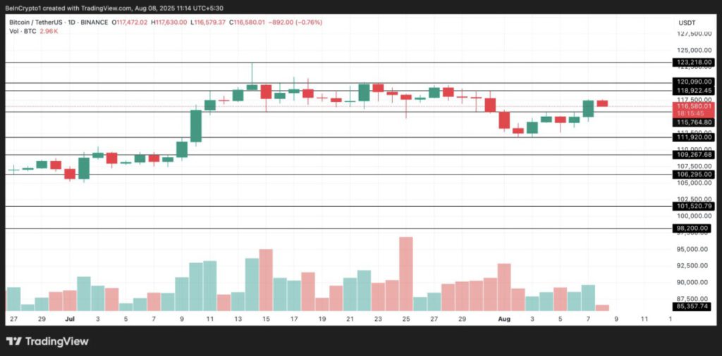 Jika tren ini berlanjut, BTC berpotensi menguji level Rp1,94 miliar ($118.922) dalam waktu dekat. Namun, jika tekanan jual kembali muncul, area Rp1,88 miliar ($115.764) akan menjadi titik uji support terdekat.
