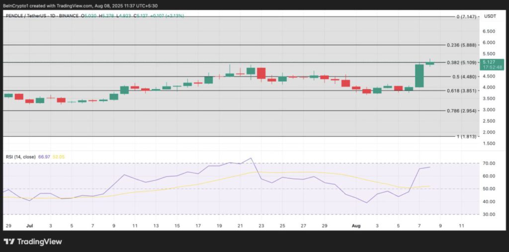 PENDLE mencatatkan lonjakan harga 27% dalam 24 jam terakhir dan kini diperdagangkan di sekitar Rp83.307 ($5,11). Berdasarkan indikator Relative Strength Index (RSI) yang berada di level 66,97, ruang kenaikan masih terbuka sebelum memasuki zona overbought (di atas 70).