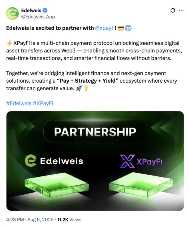 Edelweis dan XPayFi telah mengumumkan kerjasama yang bertujuan untuk mengintegrasikan solusi pembayaran canggih dalam ekosistem Edelweis. XPayFi, dengan kemampuan transfer lintas-rantai yang efisien, akan memainkan peran penting dalam pengembangan lapisan pembayaran yang inovatif.