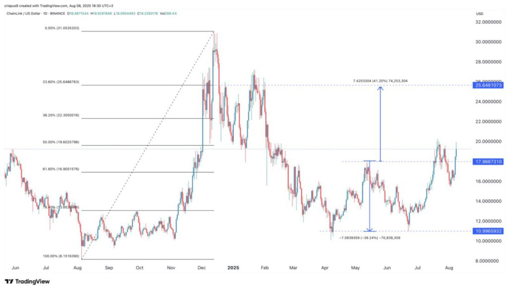 Gelombang ini berpotensi membawa harga LINK menuju $25,65, sejalan dengan level Fibonacci retracement 23,6%. Target harga ini juga konsisten dengan proyeksi pengukuran pola double-bottom, yang dihitung dari ketinggian pola hingga neckline.