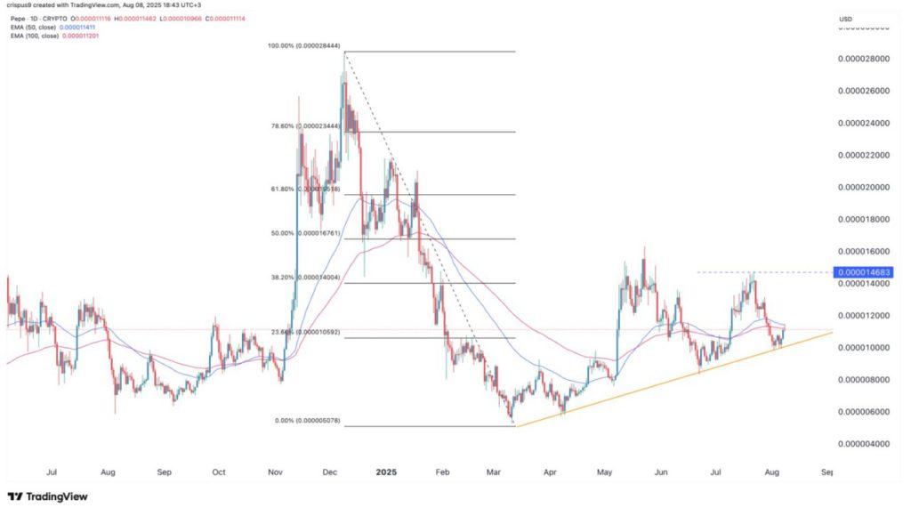 Saat ini, Pepe telah menembus level Fibonacci retracement 23,6% di $0,00001060 dan sedang berupaya merebut kembali posisi di atas moving average 50 hari. Selain itu, harga Pepe masih bertahan di atas garis tren naik (rising trendline support), yang menandakan kekuatan tren bullish.