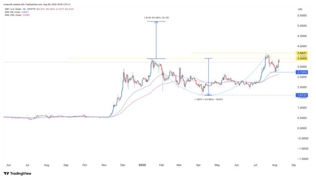 Dari sisi teknikal, harga XRP juga menunjukkan kekuatan. Pola cup-and-handle telah terbentuk, dengan batas atas di $3,40 dan titik terendah di $1,6137. Berdasarkan analisis, pola ini mengindikasikan potensi kenaikan hingga $5,20.