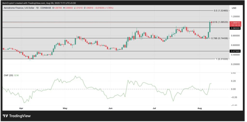 Sempat diperdagangkan di harga $1,06, AERO telah naik hampir 20% pada 9 Agustus 2025. Kenaikan ini memperpanjang tren positifnya selama seminggu terakhir, dengan total kenaikan 36% dalam tujuh hari terakhir.
