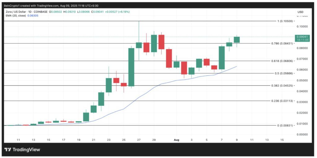 Pada grafik harian (9/8), harga ZORA berada jauh di atas exponential moving average (EMA) 20 hari, yang membentuk support dinamis di bawah harganya pada level $0,0630.