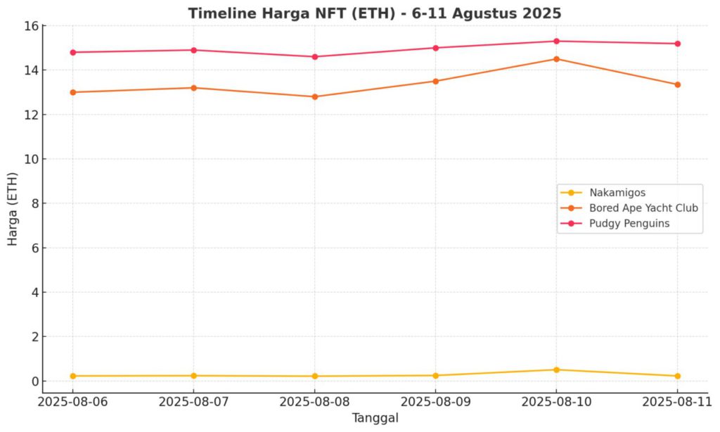 Ketiga koleksi NFT teratas pada Agustus 2025 menunjukkan perbedaan karakteristik yang mencolok: Nakamigos unggul dalam volume penjualan massal, BAYC mempertahankan citra eksklusif dengan harga tinggi, dan Pudgy Penguins menawarkan stabilitas harga serta komunitas yang kuat.