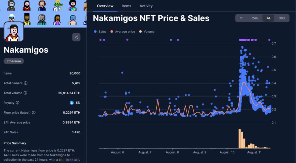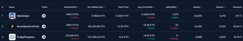 Nakamigos memimpin daftar dengan volume perdagangan harian mencapai 446,17 ETH, meski mengalami penurunan sebesar 16,15% dalam 24 jam terakhir. Koleksi ini memiliki total pasokan 20.000 item dengan 5.419 pemilik, menunjukkan distribusi kepemilikan yang relatif luas.