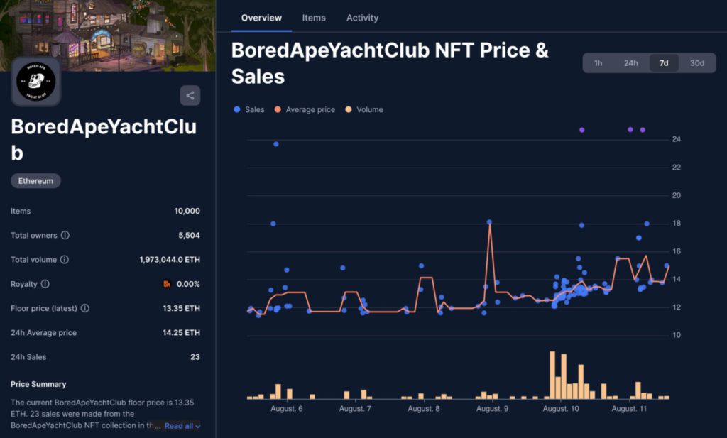 Floor price BAYC saat ini berada di 13,35 ETH (sekitar Rp216,72 juta), dengan rata-rata harga harian 14,26 ETH. Meskipun penjualan dalam 24 jam terakhir hanya 23 transaksi, harga tinggi dan nilai pasarnya yang mencapai ratusan ribu ETH membuktikan bahwa BAYC masih diminati kalangan kolektor dan investor kelas atas.