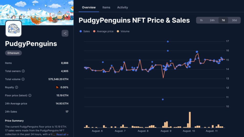 Pudgy Penguins berada di posisi ketiga dengan volume perdagangan 253,98 ETH dalam 24 jam terakhir, turun 61,07%. Koleksi ini memiliki 8.888 item yang dimiliki oleh 4.905 pemilik, dengan floor price 15,19 ETH (sekitar Rp246,39 juta) dan rata-rata harga harian 14,93 ETH.