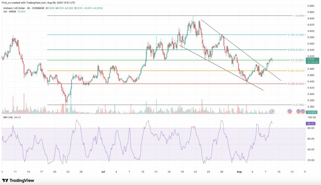 Per 8 Agustus, ARKM diperdagangkan di kisaran $0,50, dengan pola teknikal yang mirip dengan Worldcoin.
