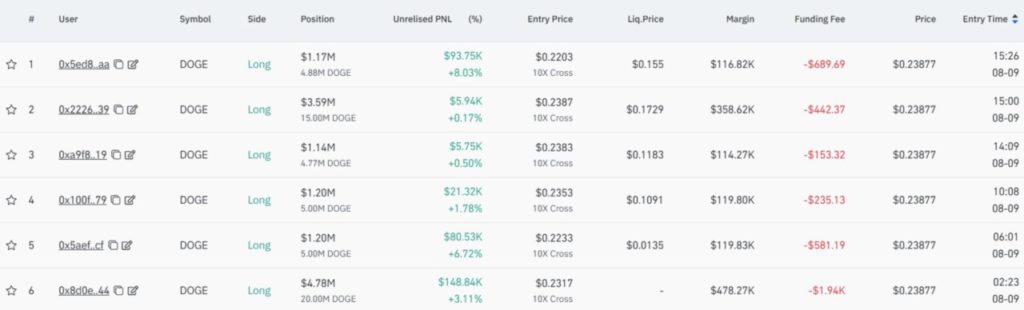 Data Hyperliquid menunjukkan bahwa hanya dalam 24 jam (9/8), para whale membuka posisi long Dogecoin senilai lebih dari $12 juta. Aktivitas ini mengindikasikan kesediaan mereka mempertahankan posisi meski harga DOGE tengah menguji level resistensi yang sebelumnya gagal ditembus.