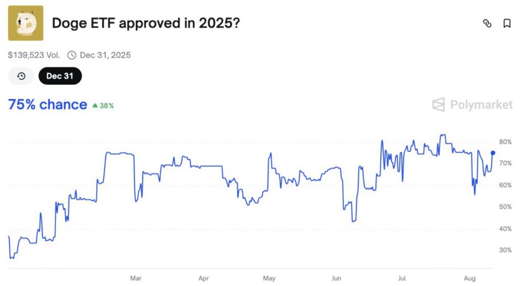 Peluang SEC untuk menyetujui ETF spot Dogecoin melonjak signifikan. Berdasarkan data Polymarket, probabilitasnya naik dari 51% pada Kamis menjadi 75% pada 11 Agustus 2025, mencerminkan meningkatnya keyakinan bahwa regulator AS akhirnya akan memberi lampu hijau pada produk tersebut.