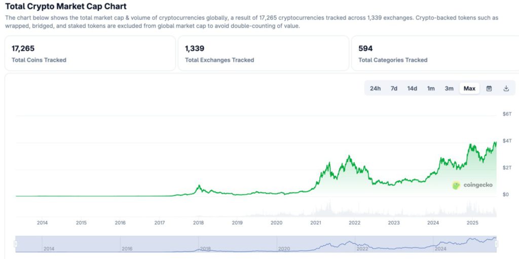 Pasar crypto mencapai kapitalisasi total sekitar $4,13 triliun, melampaui rekor sebelumnya sekitar $3,9 triliun. Lonjakan ini menandai kenaikan 1,8% dalam 24 jam terakhir. Platform CoinMarketCap juga melaporkan angka serupa, yaitu kapitalisasi pasar telah melampaui $4,06 triliun, diiringi lonjakan volume perdagangan harian hingga $180 miliar.