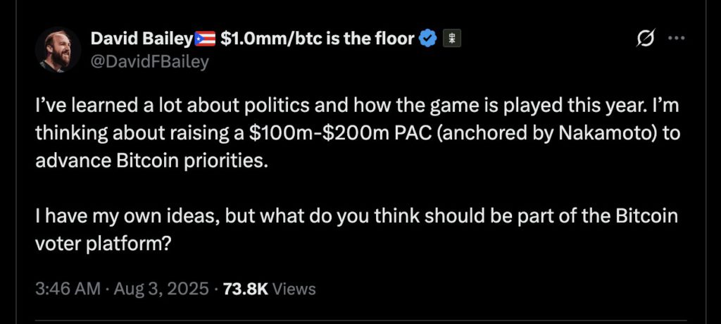 David Bailey pernah menyebutkan di X bahwa ia akan melakukan “smash buy” Bitcoin senilai $1 miliar dalam satu kali transaksi, menandakan niat kuat Nakamoto Holdings untuk menjadi pemain besar di ranah BTC.