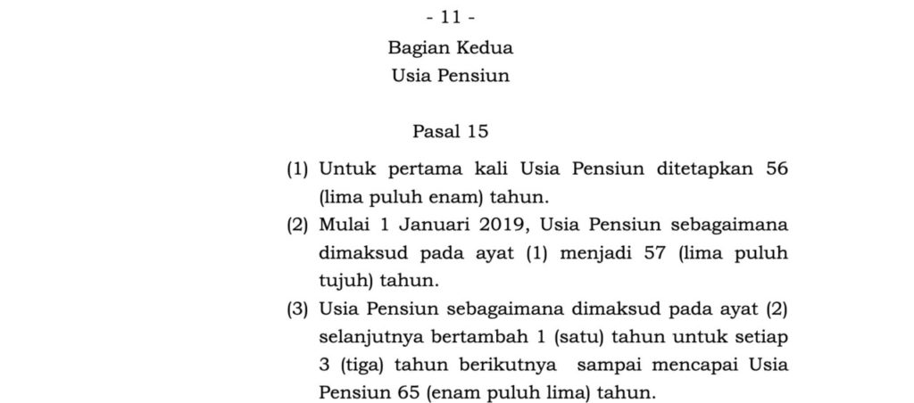 Mengacu pada Pasal 15 PP Nomor 45 Tahun 2015 tentang Penyelenggaraan Program Jaminan Pensiun, usia pensiun awalnya ditetapkan 56 tahun, naik menjadi 57 tahun per 1 Januari 2019, dan bertambah 1 tahun setiap 3 tahun hingga maksimal 65 tahun.