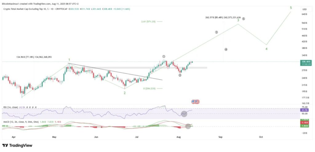 Dengan demikian, altcoin yang paling menjanjikan untuk Agustus kemungkinan besar justru berasal dari luar 10 besar, karena grafik memproyeksikan kenaikan minimal 85% hingga mencapai kapitalisasi pasar $571 miliar dalam beberapa minggu ke depan.