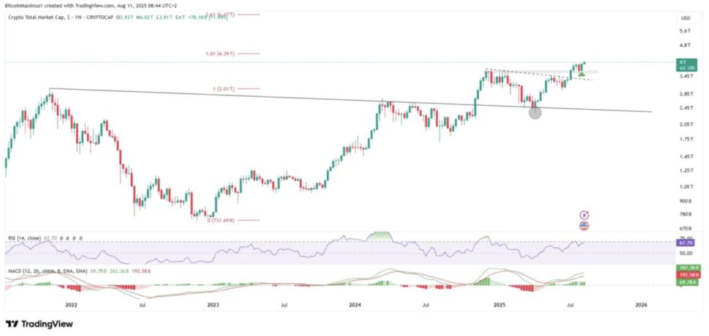 Jakarta, Pintu News ā Pasar crypto tengah melesat, dengan TOTALCAP mencetak rekor tertinggi baru setelah berhasil menembus level kunci dan menunjukkan momentum kuat pada 11 Agustus 2025.