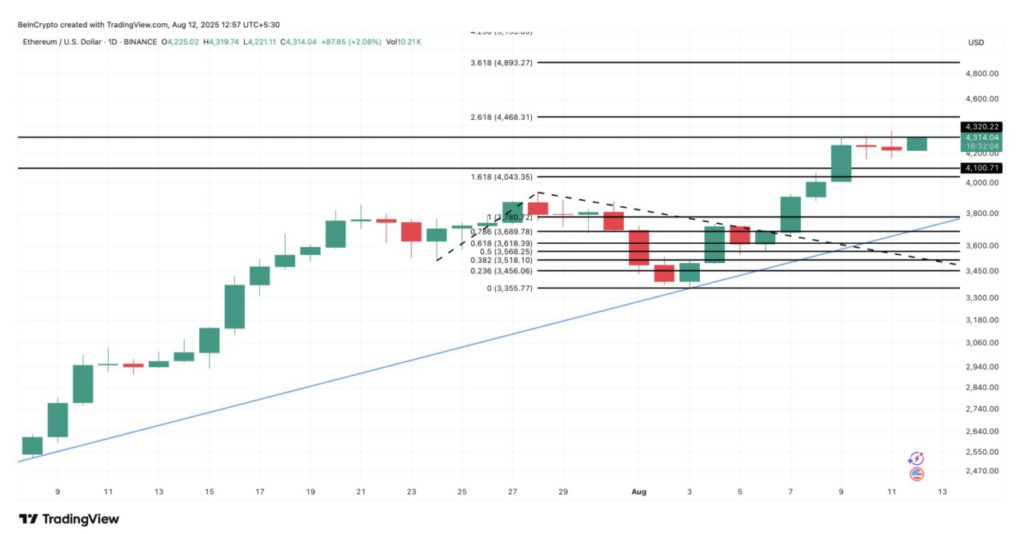 Dari sudut pandang teknikal, Ethereum saat ini bergerak dalam pola kelanjutan bullish (ascending triangle), dengan resistensi kunci di $4.468, yang merupakan level ekstensi Fibonacci 2,618 dari reli terbarunya.