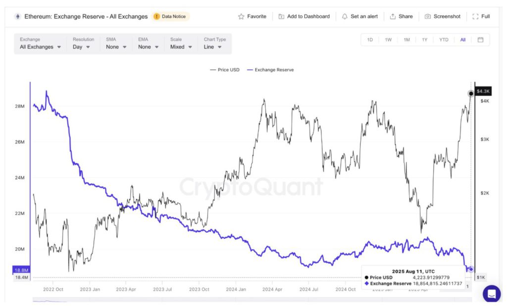 Pada 31 Juli, cadangan ETH di bursa mencapai rekor terendah sepanjang masa di 18,72 juta ETH. Per 12 Agustus, jumlah tersebut masih berada di kisaran yang hampir sama, yaitu 18,85 juta ETH, meskipun harga ETH telah melonjak tajam.