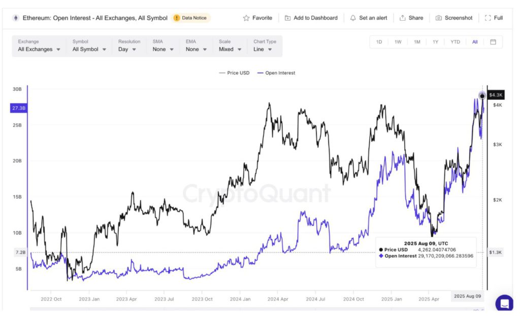 Jika pasar spot adalah fondasinya, maka pasar derivatif adalah pemicunya. Open interest—nilai total kontrak berjangka dan kontrak perpetual yang masih terbuka—mencapai rekor tertinggi sebesar $29,17 miliar pada 9 Agustus dan hingga kini masih berada di kisaran tersebut.