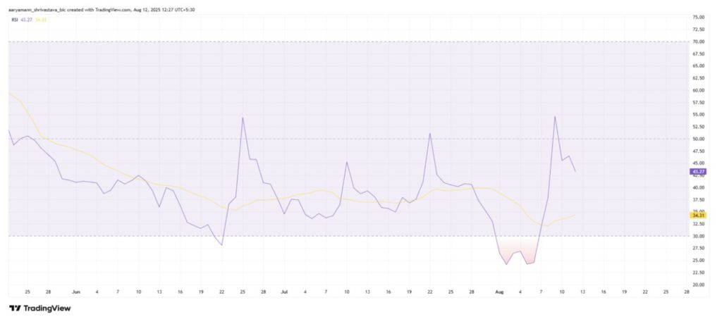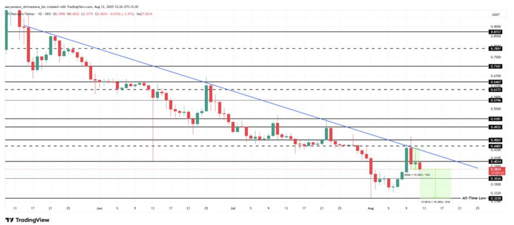 Pada 12 Agustus, Pi Coin sempat diperdagangkan di level $0,383 setelah gagal menembus resistensi penting di $0,440. Kegagalan tersebut memicu penurunan sebesar 12% dalam tiga hari terakhir, memperkuat tren penurunan yang telah berlangsung selama tiga bulan.