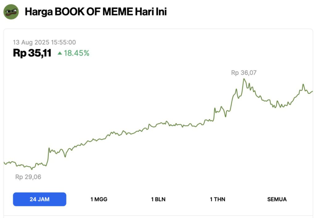 BOOK OF MEME menempati posisi ke-empat dalam kategori 5 meme coin yang ikut naik selagi ETH melonjak hari ini. Mengalami peningkatan 18,45% dalam waktu 24 jam terakhir, BOME sempat berada di titik terendahnya Rp29,06 sebelum akhirnya naik ke titik tertingginya di Rp36,07.