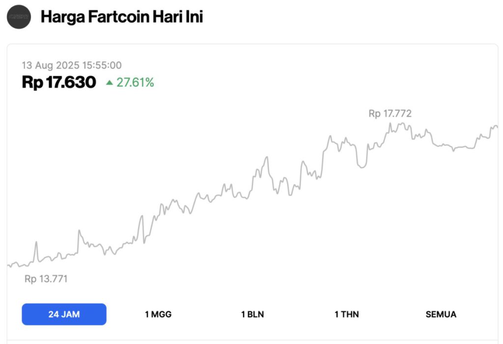 Tercatat di laman Pintu Market, harga Fartcoin mengalami lonjakan sebesar 27,61% dalam waktu 24 jam, dan kini diperdagangkan di sekitar Rp17.630. Dalam periode hari ini, FARTCOIN sempat menyentuh harga terendahnya di Rp13.771 dan harga tertingginya di Rp17.772.