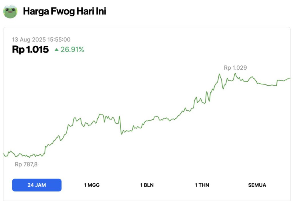 Meme coin kedua yang ikut mengalami kenaikan hari ini adalah Fwog (FWOG). Melonjak 26,91% mencapai Rp1.015, harga FWOG bergerak dari harga terendahnya di Rp787,8 ke harga tertingginya di Rp1.029 dalam waktu 24 jam terakhir.
