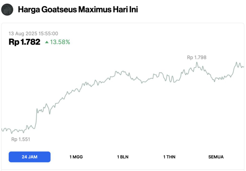 Goatseus Maximus menjadi meme coin ke lima yang nilainya ikut melejit selagi harga ETH naik hari ini. Melonjak 13,58% dan kini diperdagangkan di sekitar Rp1.782, GOAT sempat bergerak dari harga terendahnya Rp1.551 ke harga tertingginya di Rp1.798 dalam periode 24 jam terakhir.